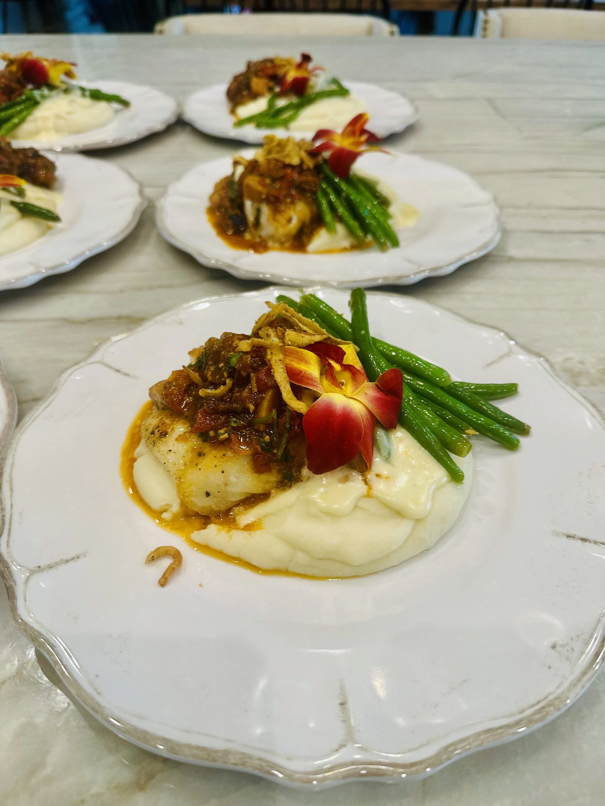 Private Chef Services Lime Scented Grilled Chicken Breast on Cauliflower Mash & Tomato Salad Cassava Persillade with Juicy Wild Caught Gulf Shrimps Crusted-Juicy Peppercorn Crusted Steaks with Charred mushrooms on Buttery Sweet potato Dices. Lime Scented Grilled Chicken Breast on Cauliflower Mash & Tomato Salad Cassava Persillade with Juicy Wild Caught Gulf Shrimps Crusted-Juicy Peppercorn Crusted Steaks with Charred mushrooms on Buttery Sweet potato Dices. Lime Scented Grilled Chicken Breast on Cauliflower Mash & Tomato Salad Cassava Persillade with Juicy Wild Caught Gulf Shrimps Crusted-Juicy Peppercorn Crusted Steaks with Charred mushrooms on Buttery Sweet potato Dices. Lime Scented Grilled Chicken Breast on Cauliflower Mash & Tomato Salad Cassava Persillade with Juicy Wild Caught Gulf Shrimps Crusted-Juicy Peppercorn Crusted Steaks with Charred mushrooms on Buttery Sweet potato Dices. Birthday Dinner Starter Course.A Parisian Spring Inspired Salad. A perfectly Seared Coconut Crusted Seared Scallops with Balsamic Zucchini & Squash Cauliflower Steak topped with Meaty Mushrooms, Caramelized Onions and Toasted Pepitas Birthday Dinner Dessert Course.Homemade Pecan Pie w/Vanilla ice cream, topped with Berries n Mint A delicious braised Beef Shank on Pomme Puree topped w/crispy Vidalia Onions Fall Inspired Salad with Crispy Cheese Balls & Nuts. A Zesty Seared Seabass on Buttery Couscous, Lemon Asparagus Mediterranean Sauce Crostini w/ all Spring Flavors - Yum! Perfectly Seared PK Spiked Salmon on Spring Salad - Light & Nutritious! Prime Ribeye Steak on Silky Mashed Potatoes & Mushroom Sauce - Yum! Winter Inspired Salad with crispy toppings. So good! Creamy Pumpkin Soup w/Seasoned Toppings - Comfy Food of the season! Book your special event with us today! Menu will be curated to meet your need!